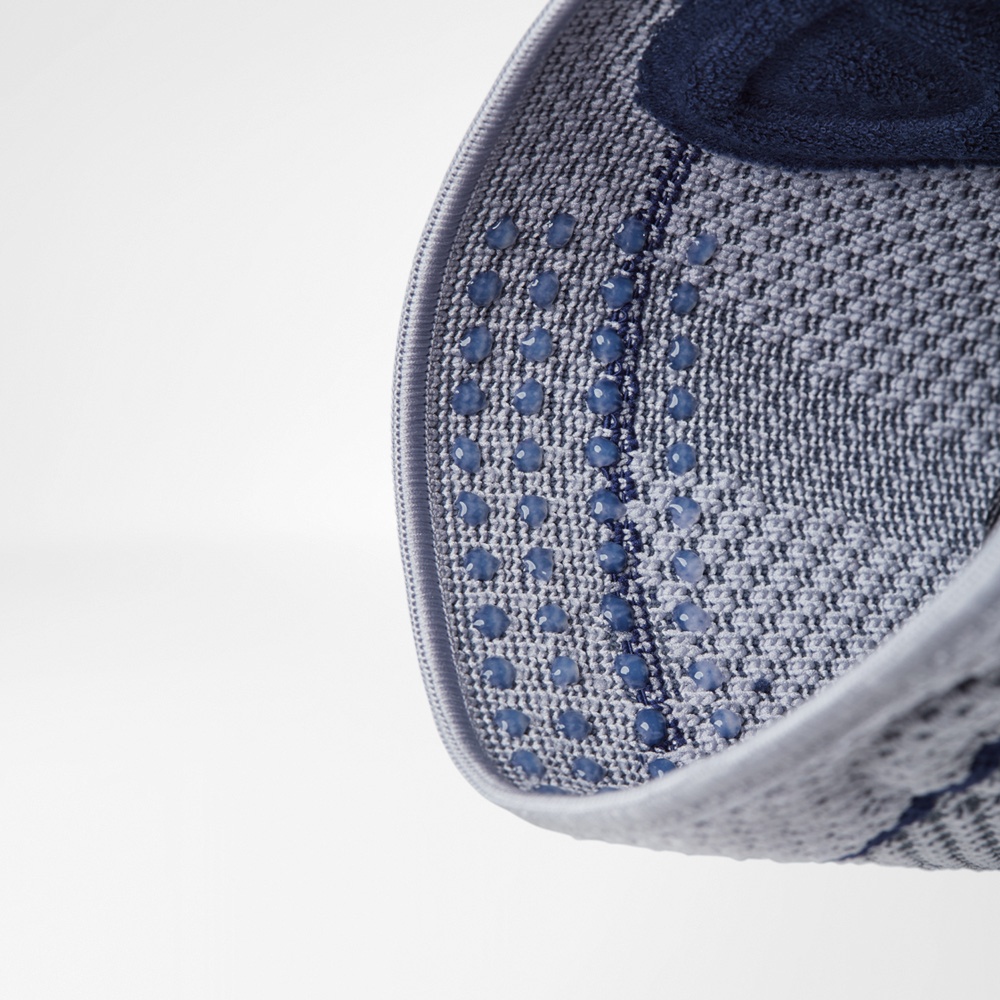De Kniebrace Bauerfeind GenuTrain met Siliconenboord blijft altijd goed zitten. Door het sterk gestructureerde oppervlak van het Train-breiwerk hecht de bandage zich beter aan de huid. De kunststof baleinen aan de zijkant hebben flexibele buigzones, die de bewegingspatronen van de drager volgen en zo het breiwerk zeer slipvast om de knie spannen. Aan de baleinen geïntegreerde aan- en uittrekhulpen vergemakkelijken het aan- en uittrekken van de bandage. Dankzij de randen met afnemende compressie en een zachte, luchtiger gebreide comfortzone in de knieholte is de GenuTrain aangenaam om dragen, ook tijdens langere bewegingsintensieve delen van de dag.