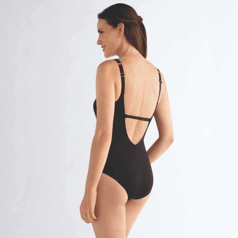 Prothese bapdpak Singapore van Amoena is een stijlvol badpak in het zwart met bij de taille gouden palletten print.