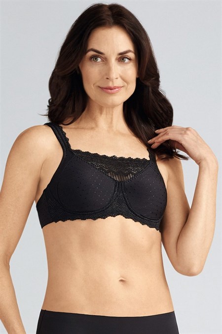 Stevig aansluitende beha, geeft een perfecte pasvorm. Comfortabele en elastische verstelbare schouderbandjes. Decoratieve kant biedt een perfecte oplossing voor te lage décolletés, om littekens of brandwonden door bestraling te verbergen.
